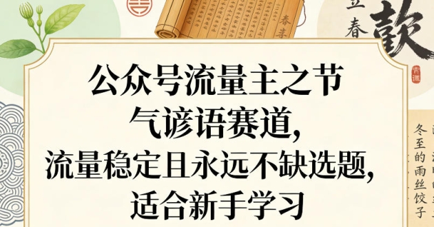 公众号流量主之节气谚语赛道,流量稳定且永远不缺选题,适合新手学习 项目介绍: 公众号节气谚语赛道,是零门槛、稳流量、长期可做的流量主变现项目。主打 ...