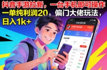 抖音手游拉新,一台手机即可操作,一单纯利润20,偏门大佬玩法,日入1k+【揭秘】 项目介绍 这个项目就是信息差差价玩法。游戏厂家为了推销游戏而做的新推, ...