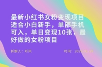 小红书女粉最新变现项目,适合小白新手,单部手机可入,单日变现多张 项目介绍: 该项目可以称之为最简单的女粉变现项目,不仅0成本,而且不需要浪费太大的 ...