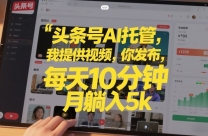 头条号AI托管,我提供视频,你发布,每天10分钟,月躺入5k+【揭秘】 项目介绍: 没有想搞副业賺钱的?没多少时间、没技术,还不想干打杂的辅助活,觉得纯属 ...